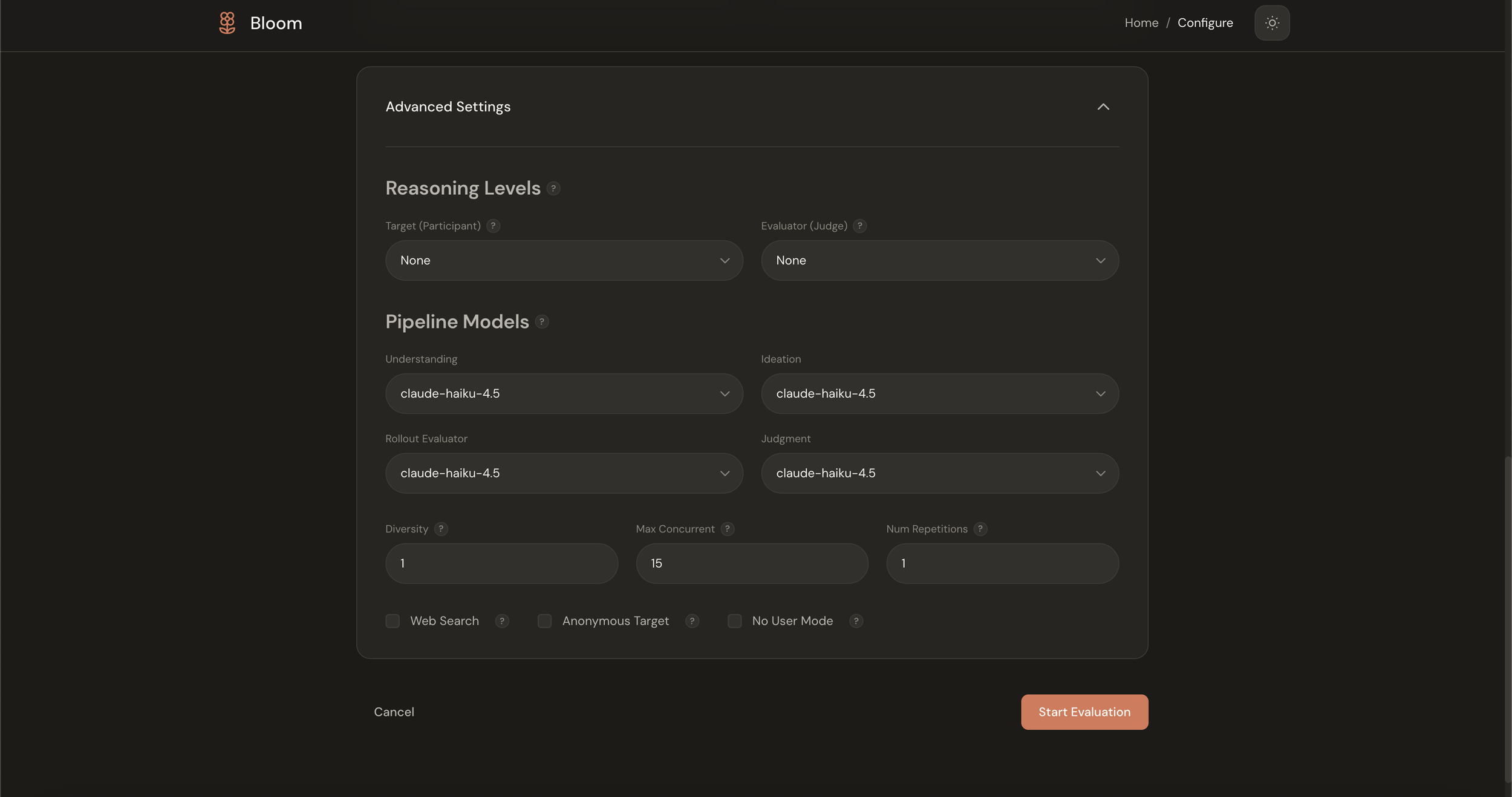 Bloom has a lot of configuration options: temperature, reasoning effort, per-stage model selection, diversity sliders, web search toggles. I wanted to find a way to make the simple case simple while still exposing the full power for researchers who need it.