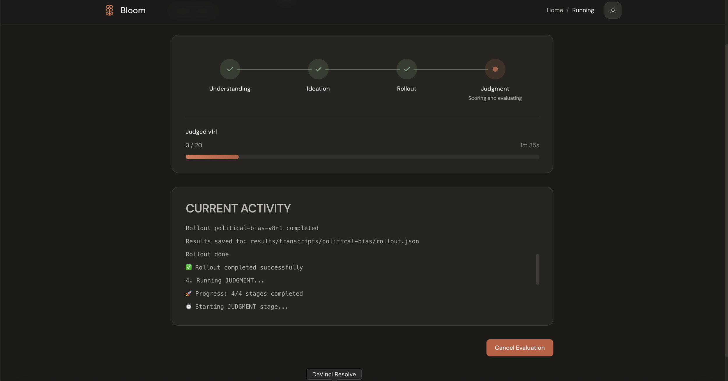 Progress makes the pipeline legible. Bloom's four stages, Understanding, Ideation, Rollout, and Judgment, appear as a visual stepper so you can see what's happening without parsing terminal output.