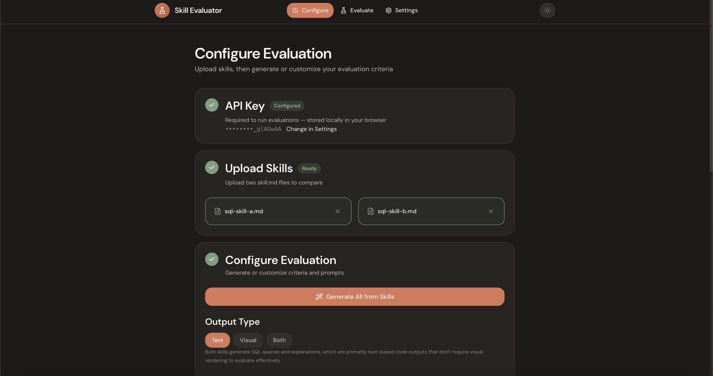 Want to test two different SQL skills? Upload them, generate criteria about query efficiency and readability, run the eval. Testing writing skills? Same flow, but with criteria about clarity and voice. The auto-generation feature handles most of the setup work, analyzing your skill files and proposing appropriate tests, though you can always override it with your own criteria and prompts if you have specific things you want to measure.